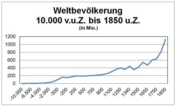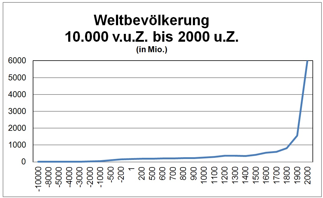 Nach heutigen Schätzungen stieg von 10.000 bis 8.000 v.u.Z. die Bevölkerungszahl von 1 auf 5 Mio. Individuen. Anschließend begann eine über neuntausendjährige Phase der langsamen Vermehrung. Für eine Verdopplung der Bevölkerung benötigte die Menschheit jeweils ca. 1.000 Jahre. Das entspricht einer Zuwachsrate von unter 0,1 Prozent pro Jahr. Erst mit dem Beginn des 18. Jahrhunderts steigerte sich das Wachstum auf eine Verdopplung in 150 Jahre und beschleunigte sich in der 2. Hälfte des 20. Jahrhunderts auf 40 Jahre.