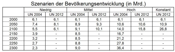 2004 veröffentlichte die UN eine herausragende Studie über die Bevölkerungsentwicklung der nächsten 300 Jahre. Es erfolgte keine Betrachtung des „Status-quo“. Kernaussage: Das Wachstum der Bevölkerung verlangsamt sich deutlich. Selbst im hohen Szenario dauert die Verdopplung der heutigen Bevölkerung auf 14 Mrd. Menschen voraussichtlich bis zum Ende des 21. Jahrhundert – über 80 Jahre. Die nächste Verdopplung auf 28 Mrd. würde erst Mitte des 23. Jahrhunderts vollendet – nach nochmals 150 Jahren. Damit entspräche die Bevölkerungszunahme auch im dynamischsten Szenario „nur“ der des 17./18. Jahrhunderts. Im Szenario für die niedrigste Entwicklung erfolgt ab dem Jahr 2050 sogar ein kontinuierlicher Rückgang. Erst im 23. Jahrhundert stabilisiert sich hier die Bevölkerung bei knapp über 2 Mrd. Menschen.