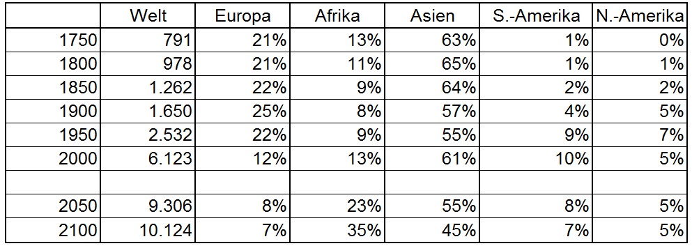 Über Jahrtausende hinweg lebte über 70 Prozent der weltweiten Bevölkerung auf dem eurasischen Kontinent – Mitte des 19. Jahrhunderts sogar über 85 Prozent. Mehrere Wachstumsschübe – im 19. Jahrhundert in Europa und im 20. in Asien – überdeckten die seitdem stattfindende Verschiebung der Bevölkerungsgewichte. Gegenwärtig weisen in beiden Kontinenten nur wenige Staaten hohe Wachstumsraten auf. Im Gegenteil, in Europa und in den Industriestaaten Asiens setzen Bevölkerungsrückgänge ein. China sowie einige nicht-industrialisierte Staaten Südost-Asiens werden dem bald folgen.