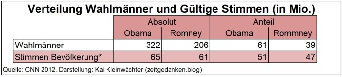 1. Die Einheit der USA wirkt auch durch den „eindeutigen“ Sieg Obamas bei den Präsidentschaftswahlen deutlich überzeichnet. Das seit der Gründung der USA im Kern nicht reformierte Wahlsystem mit indirekter Wahl des Präsidenten und Mehrheitswahlrecht reflektiert nur oberflächlich die zunehmend divergierenden inneren Kräfteverhältnisse. Landesweit betrug der Stimmenvorsprung des Präsidenten nur 4%. Es war kein Sieg Obamas sondern ein Patt zugunsten der Demokratischen Partei.