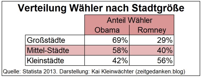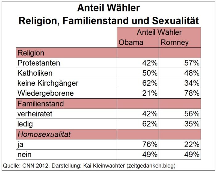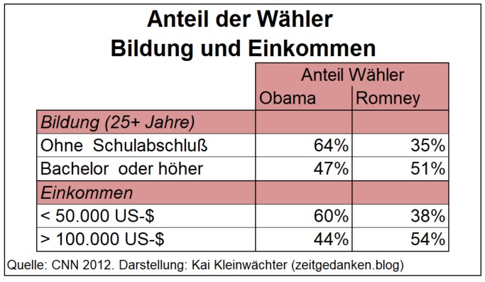 9. Die Demokraten haben es geschafft sich auf die veränderten Realitäten besser einzustellen. Sie dominierten in den großen Städten und sprachen die „neuen“ politischen Strömungen an – Umwelt-, Frauen- und Homosexuellen-Bewegung, die wachsende Gruppe der Atheisten/Konfessionslosen und auch die neuen sozialen Bewegungen (bsp. Occupy Wallstreet). Gleichzeitig konnten sie die ethnischen Minderheiten für sich gewinnen. Die Republikaner vertreten derzeit für die oben genannten Gruppen nicht akzeptable Positionen. Entsprechend stark ist die Partei dagegen in ländlichen Gebieten mit konservativ-religiösem Weltbild, vor allem im sogenannten „bible-belt“ und dem Mittleren Westen. Spiegelbildlich dominieren die Demokraten die großen Städte des Nordens und Westens der USA. Soziale Indikatoren wie Bildungsstand und Einkommen zeigen am Wahlverhalten, dass die Wirtschafts- und Sozialpolitik Obamas in den unteren Schichten auf breite Akzeptanz trifft. Die Republikaner vertreten hingegen eine auf die (obere) Mittelschicht bzw. die Oberschicht ausgerichtete Politik. Entsprechend stark ist der Zuspruch aus diesen sozialen Schichten.