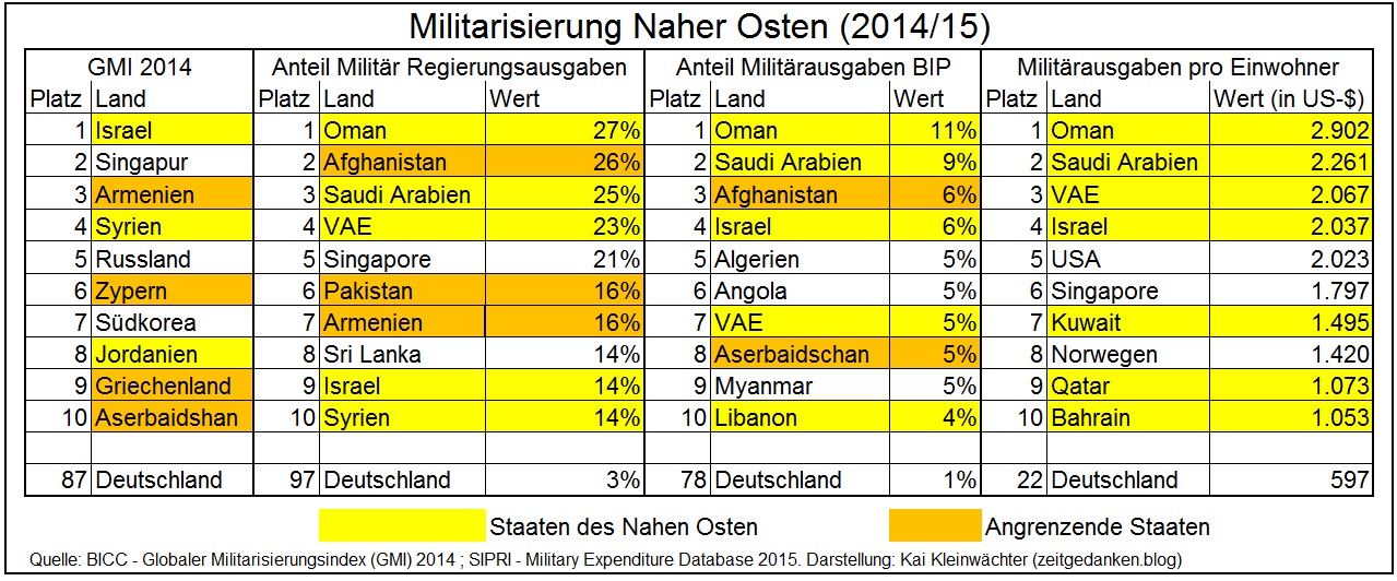 Im Vergleich mit Deutschland wird die umfassende Militarisierung überdeutlich. Die Staaten des Nahen Ostens haben einen überproportional hohen Anteil Militärausgaben am Staatshaushalt. Mehr als 13 Prozent werden für militärische Zwecke verschwendet (Deutschland knapp drei Prozent). Pro Einwohner geben sie das Doppelte für militärische Zwecke aus.