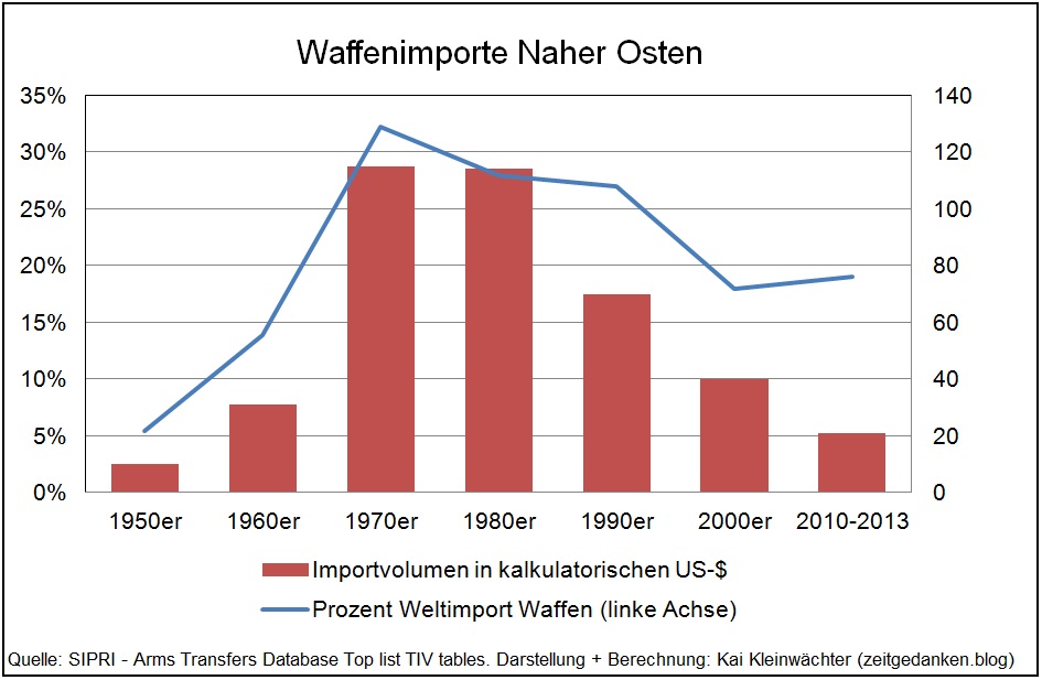 Auf Grund der zugespitzten Konflikt- und Kriegslage, einer unterentwickelten Rüstungsindustrie aber hoher Erdöl-/Erdgas-Einnahmen importiert der Nahe Osten weltweit die meisten Rüstungsgüter. Der Rückgang des Importanteils am Waffenhandel von über 30 auf heute knapp 20 Prozent täuscht. Waffenlieferungen an und durch irreguläre Strukturen wie ISIS oder die syrischen Aufständischen gehen genauso wenig in die Statistik ein, wie die militärische Unterstützung Israels ober Saudi-Arabien durch die USA bzw. die Syriens durch Russland.