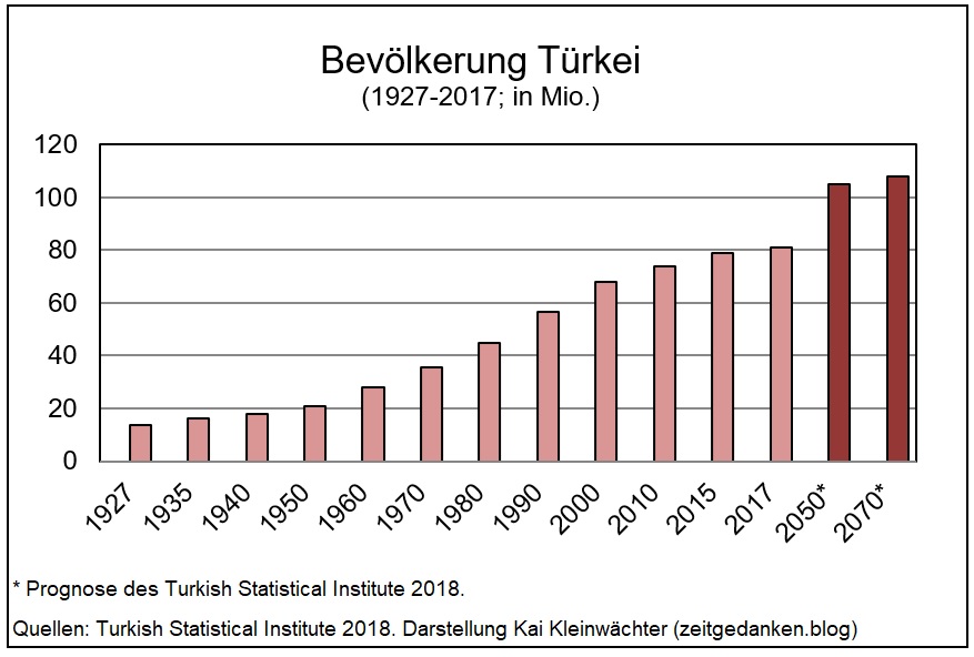 Die türkische Bevölkerung wächst nicht mehr durch Geburten als solche – sondern durch den hohen Anteil an jungen Menschen unter 20 Jahren. Er liegt bei ca. 34 Prozent. Ein typisches Anzeichen für eine neue demographische Phase. Die Türkei ähnelt aus dieser Perspektive Deutschland am Anfang des 20. Jahrhunderts. Ähnlich wie damals Deutschland, wird die türkische Bevölkerung mit abnehmender Geschwindigkeit noch 30 bis 50 Jahre weiter wachsen. Entsprechend prognostiziert mit circa 108 Millionen Einwohnern.[2]