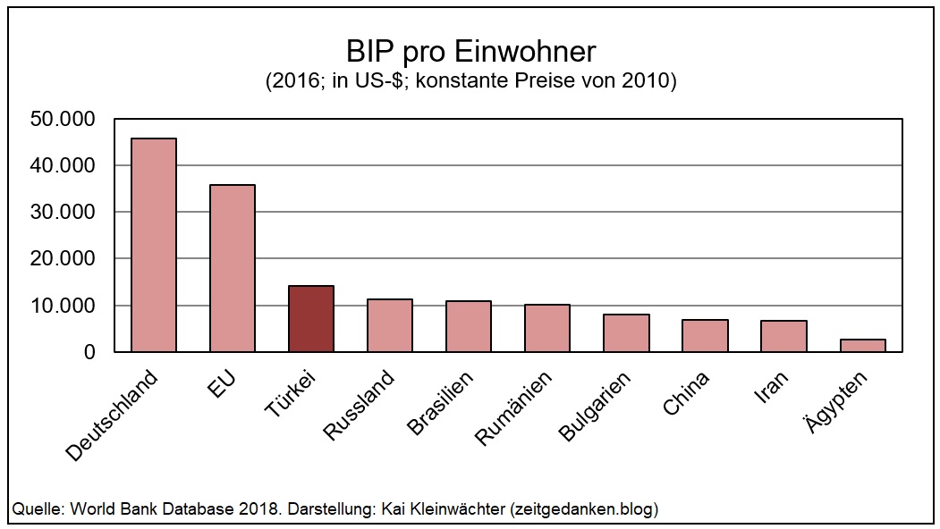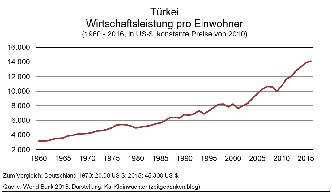 Damit erreicht die Türkei eine vergleichbare Wirtschaftsleistung wie Russland und Brasilien und liegt deutlich vor seinen Nachbarn. Aber ein Vergleich mit hochentwickelten Staaten, z.B. Deutschland zeigt, wie weit der Weg noch ist. Die Wirtschaftskraft pro Einwohner lag in (West-)Deutschland bereits in den 1950er Jahre auf dem Niveau der heutigen Türkei – nach einer fast 30-jährigen Stagnation in Folge (verlorener) Weltkriege und Wirtschaftskrisen. Gegenwärtig erwirtschaftet Deutschland etwas über 45.000 US-$. Gemessen an dieser Wirtschaftskraft pro Einwohner hat die Türkei einen Rückstand von über einem halben Jahrhundert.