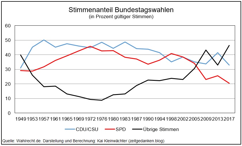 Mit der Bundestagswahl 2005 brach der Stimmenanteil der „Möchtegern“-Großparteien in sich zusammen. 2009 und 2017 erhielten sie nur knapp über die Hälfte der abgegebenen Stimmen und repräsentierten auf Grund gesunkener Wahlbeteiligung „gerade noch 40 Prozent der Wähler“ (Decker, Frank 2009). Beide(!) erzielen ihre historisch schlechtesten Ergebnisse. Darüber kann auch der kurze Höhenflug der CDU 2013 nicht hinwegtäuschen.