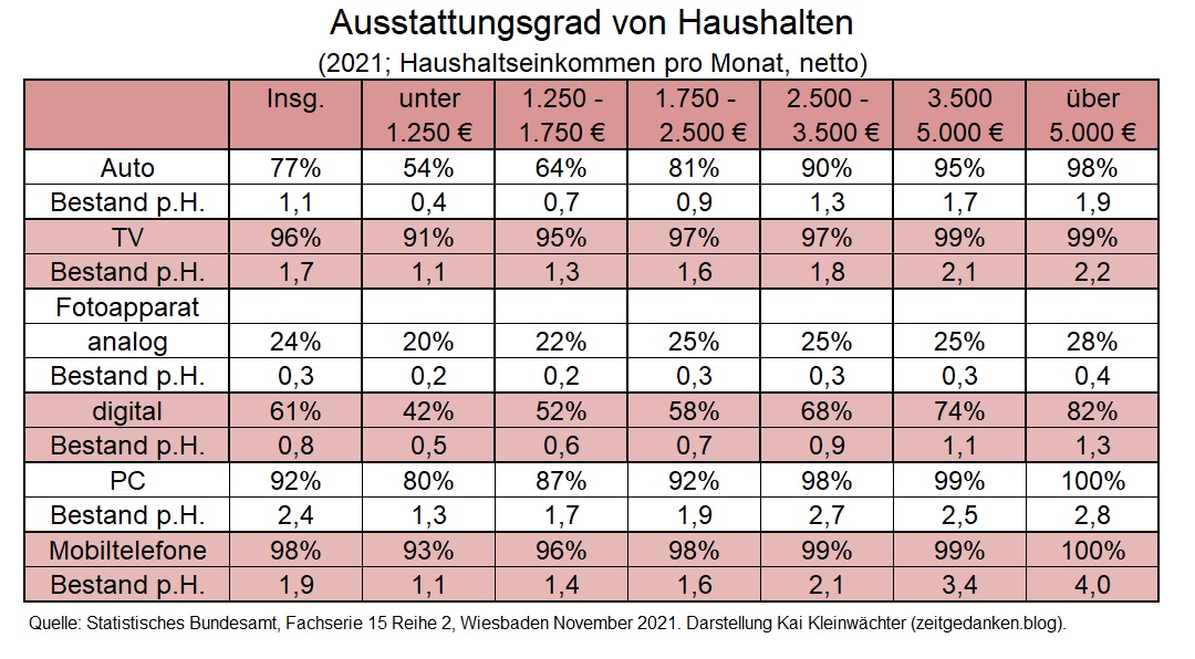 Selbst für ökonomisch prekäre Schichten ist das alles erschwinglich. Die Einrichtung der Wohnung hängt kaum noch am Geldbeutel – dafür umso mehr an Geschmack, Lebensumständen sowie Gesundheitszustand, Bildungsgrad, Interessen und Charakter sowie der Peer-Group.