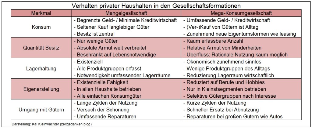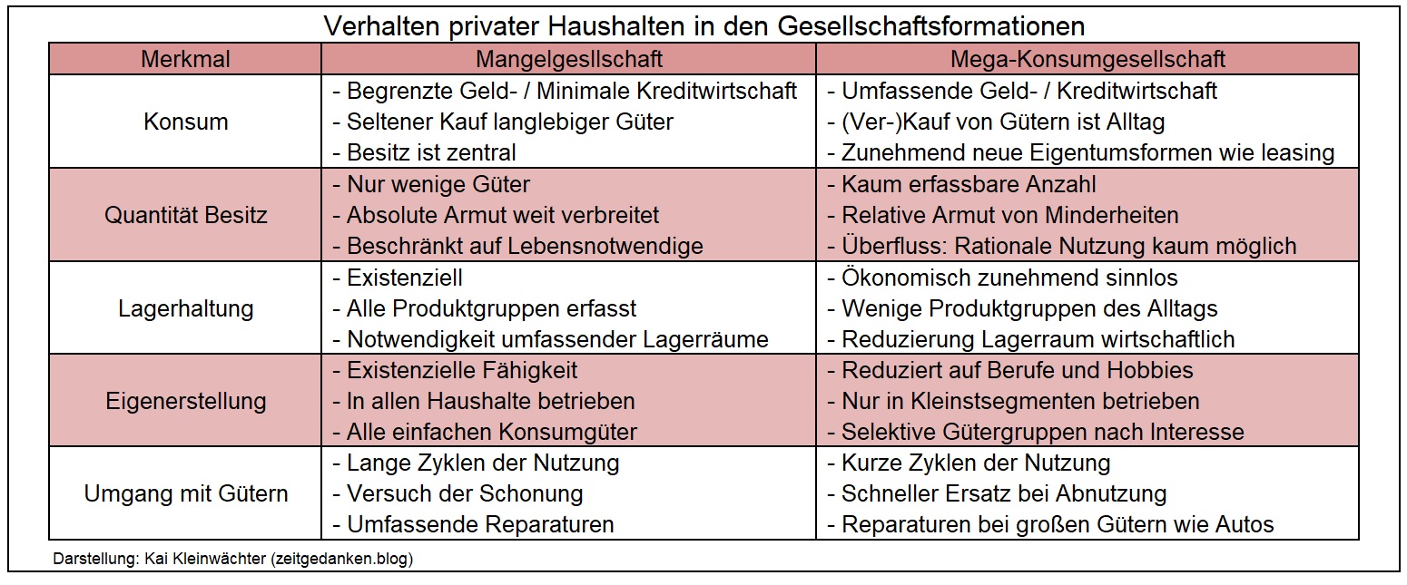 Im Übergang zur Mega-Konsumgesellschaft geht die traditionelle Lagerhaltung deutlich zurück und schwindet die Eigenerstellung (fast) völlig. Gleichzeitig nimmt die Anzahl der Güter in den privaten Haushalten explosionsartig zu. Gegenwärtig verfügen selbst Haushalte mit niedrigem Einkommen über mehr als 1.000 Gegenstände. Die Nutzung des einzelnen Gegenstandes wird selten. Eigentlich wird nur ein Bruchteil überhaupt noch genutzt.