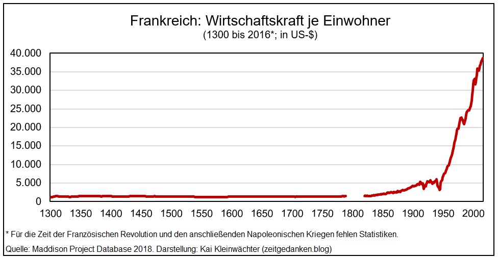 Der bedeutende Ökonom und Wachstumsforscher Angus Maddison und seine Anhänger arbeiteten die historischen Wirtschaftsdaten aller Staaten auf. Die Aussagen ihrer Statistiken sind eindeutig: Fast ein halbes Jahrtausend entwickelte sich die ökonomische Leistungskraft der französischen Gesellschaft kaum weiter. Vom 14. bis Mitte des 19. Jahrhunderts schwankte die Wertschöpfung pro Einwohner zwischen 1.100 und 1.500 US-Dollar pro Jahr. Das entspricht in etwa dem Produktivitätsniveau des heutigen Mozambique (1.288 US-Dollar).