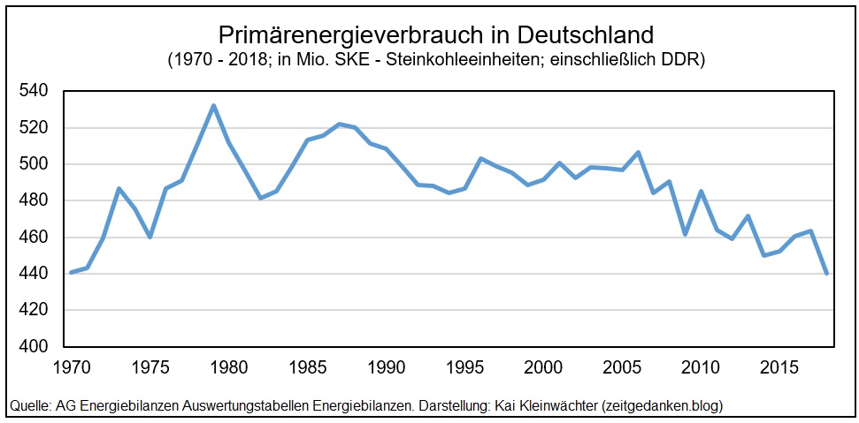 Auch hierfür steht beispielhaft Deutschland. Der Bedarf an Energie und Rohstoffen geht immer weiter zurück. Ursachen sind eine hochtechnologische Produktion sowie die Umstellung der Bevölkerung auf energiesparende Güter. Der gegenwärtige Primärenergieverbrauch – der gesamte Verbrauch an Energie einschließlich Übertragungs- und Wirkungsverlusten – entspricht inzwischen dem Stand der 1970er Jahre. Ohne den Handelsüberschuss in den energieintensiven Sektoren Kraftfahrzeug- und Maschinenbau sowie Chemie sänke der Energieverbrauch noch weiter. Das Festhalten an Basistechnologien des 19. Jahrhunderts behindert den Durchbruch in eine ökologische Gesellschaft.