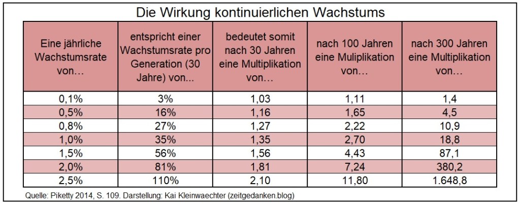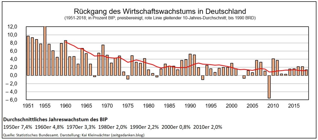In den hochentwickelten Industriestaaten gelangt die historische Phase des quantitativen Wachstums an sein Ende. Stellvertretend dafür steht das deutsche Wirtschaftswachstum. Noch in den 1970er Jahren wuchs die Wirtschaft mit durchschnittlich 3,3 Prozent pro Jahr. Seitdem flacht das Wachstum immer weiter ab. In der gegenwärtigen Dekade gewähren selbst Impulse wie u.a. ein Niedrigzinspolitik, hohe Aushandelsüberschüsse, eine Zunahme von Bevölkerung und Beschäftigung gerade einen Anschluss an das Niveau der 1980er Jahre.