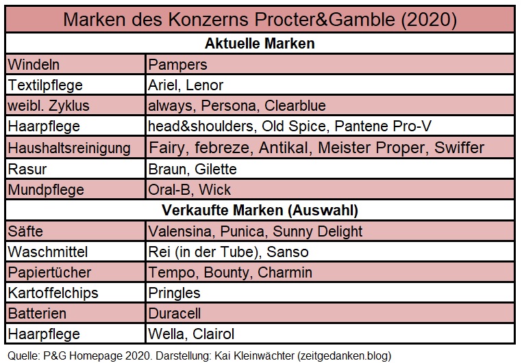 Regelmäßig werden Marken und mit Ihnen die mit ihnen die gesamt Produktion und Logistik verkauft. Ein Beispiel ist der Verkauf bzw. Abspaltung von 43 „Schönheits“-Marken im Jahre 2014 an Coty (Nach dem Reverse Morris Trust besaßen die Aktionäre von P&G 52% der Anteile von Coty.) P&G verkaufte bekannte Marken wie Wella, Max Factor sowie bekannte Parfüme wie Hugo Boss, Gucci, Lacoste und bruno banani. Die Transaktion brachte dem Konzern geschätzt 13 Mrd. US-$ ein.