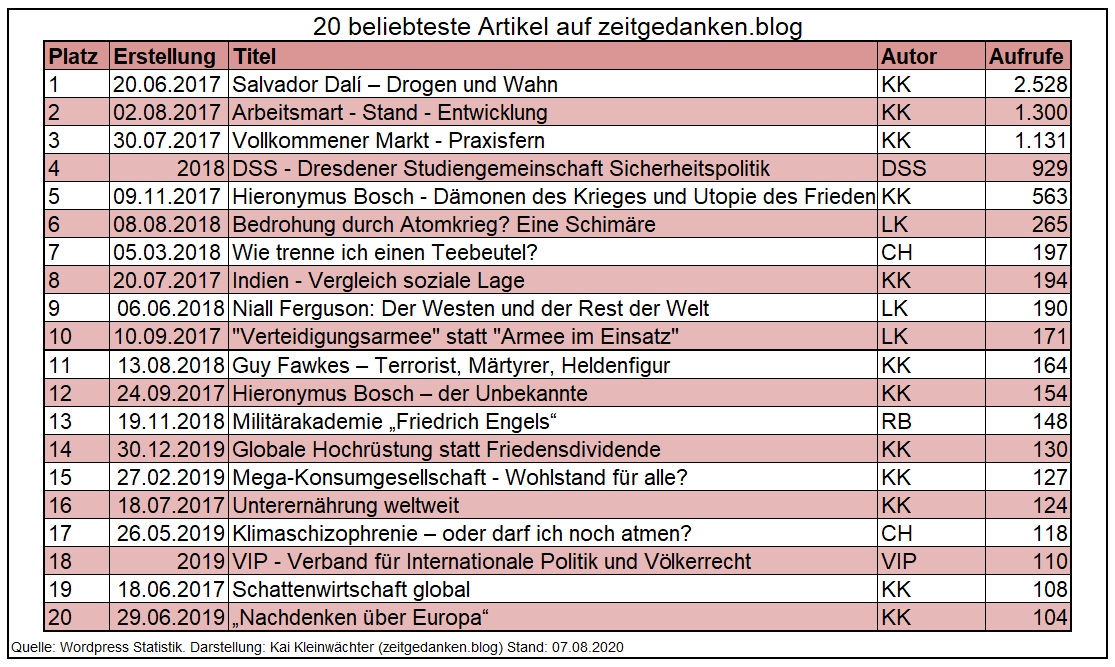 Bei den Klickzahlen ist eine starke Konzentration auf die zehn Hauptbeiträge festzustellen. Auf die Top10 entfallen rund 62 Prozent aller Klicks. Innerhalb dieser Gruppe besteht eine gewaltige Spannweite von 2.528 bis 171 Aufrufen. Absolut dominant ist „Salvador Dali – Drogen und Wahn“ mit 21 Prozent aller Klicks.