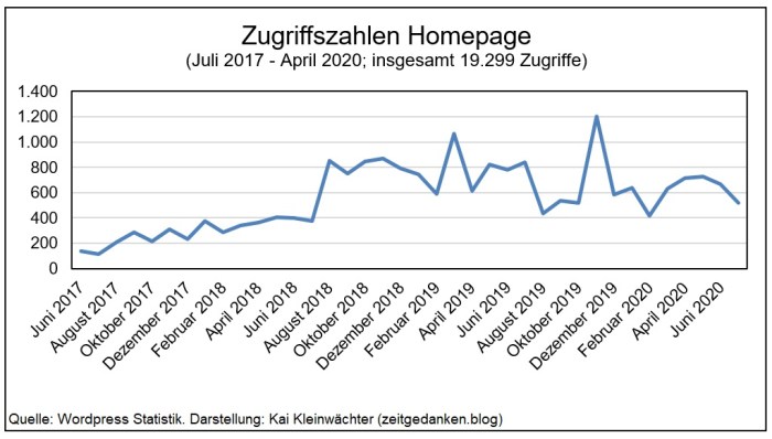 Die monatlichen Zugriffszahlen haben sich langsam gesteigert (durchschnittlich 2017 200; 2018 400; 2019/20 700). Die Schwankungsbreite von 400 bis 1.200 ist erheblich.