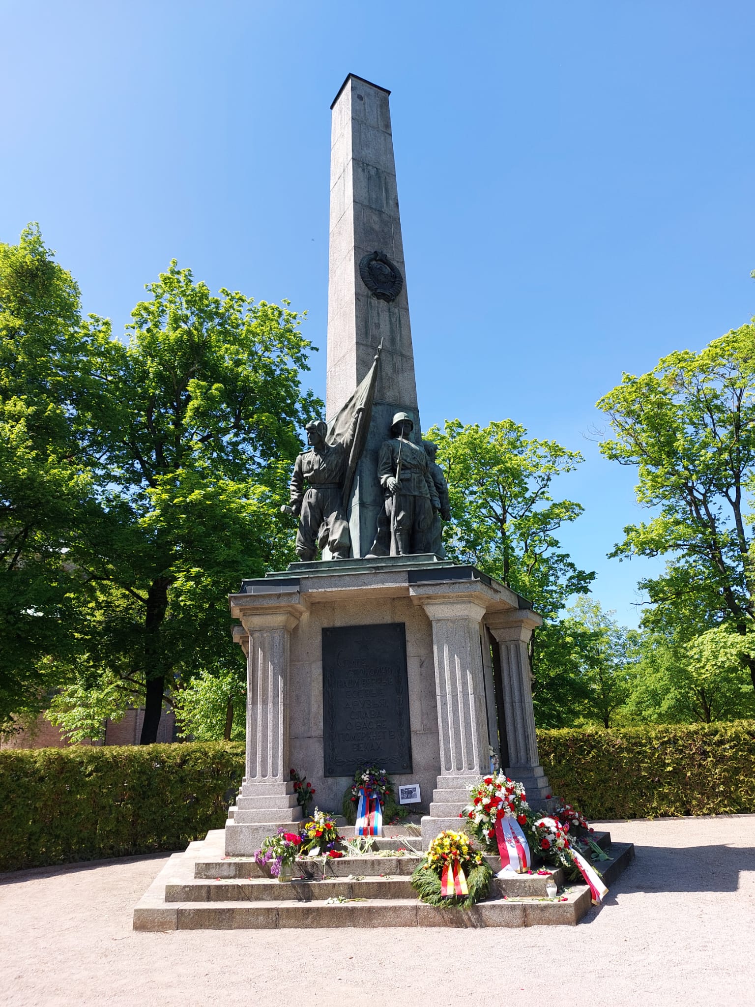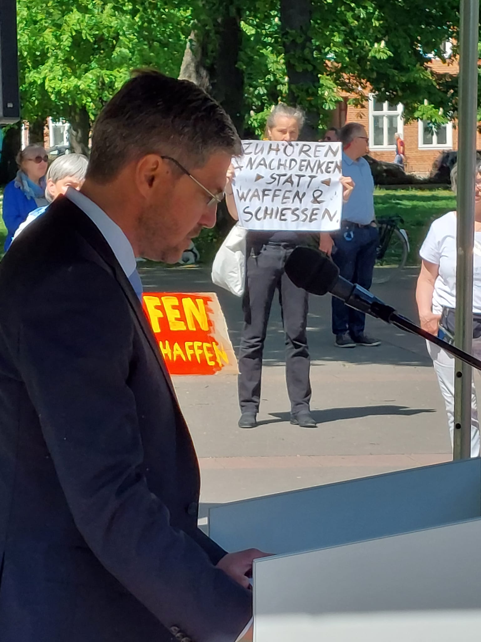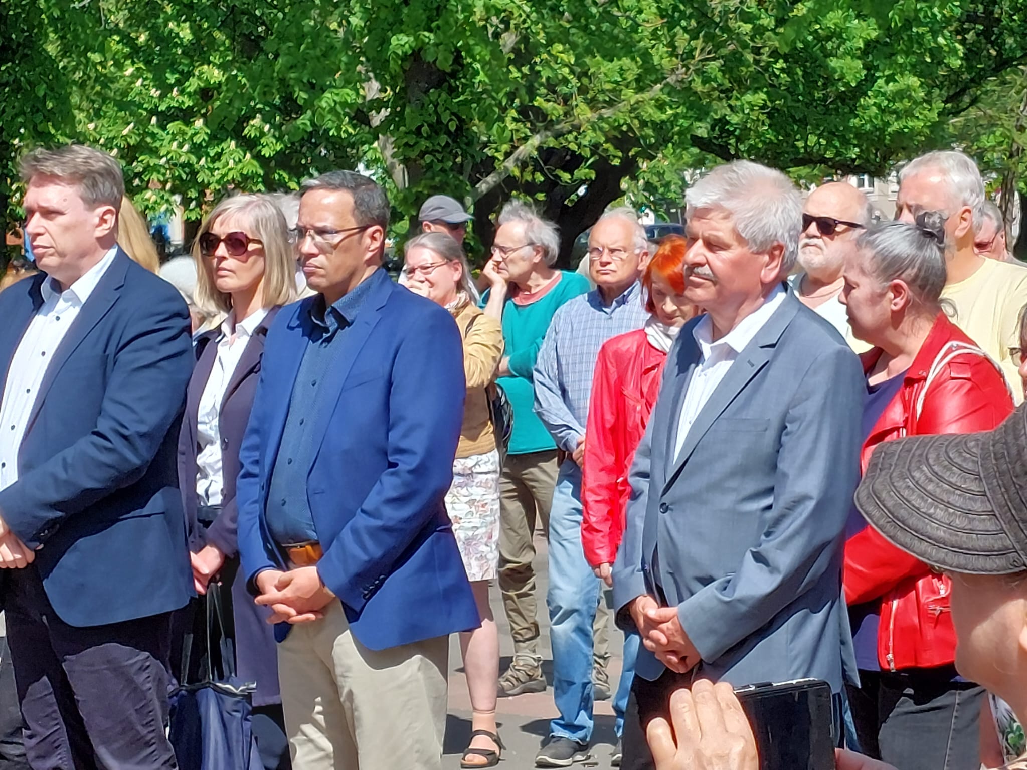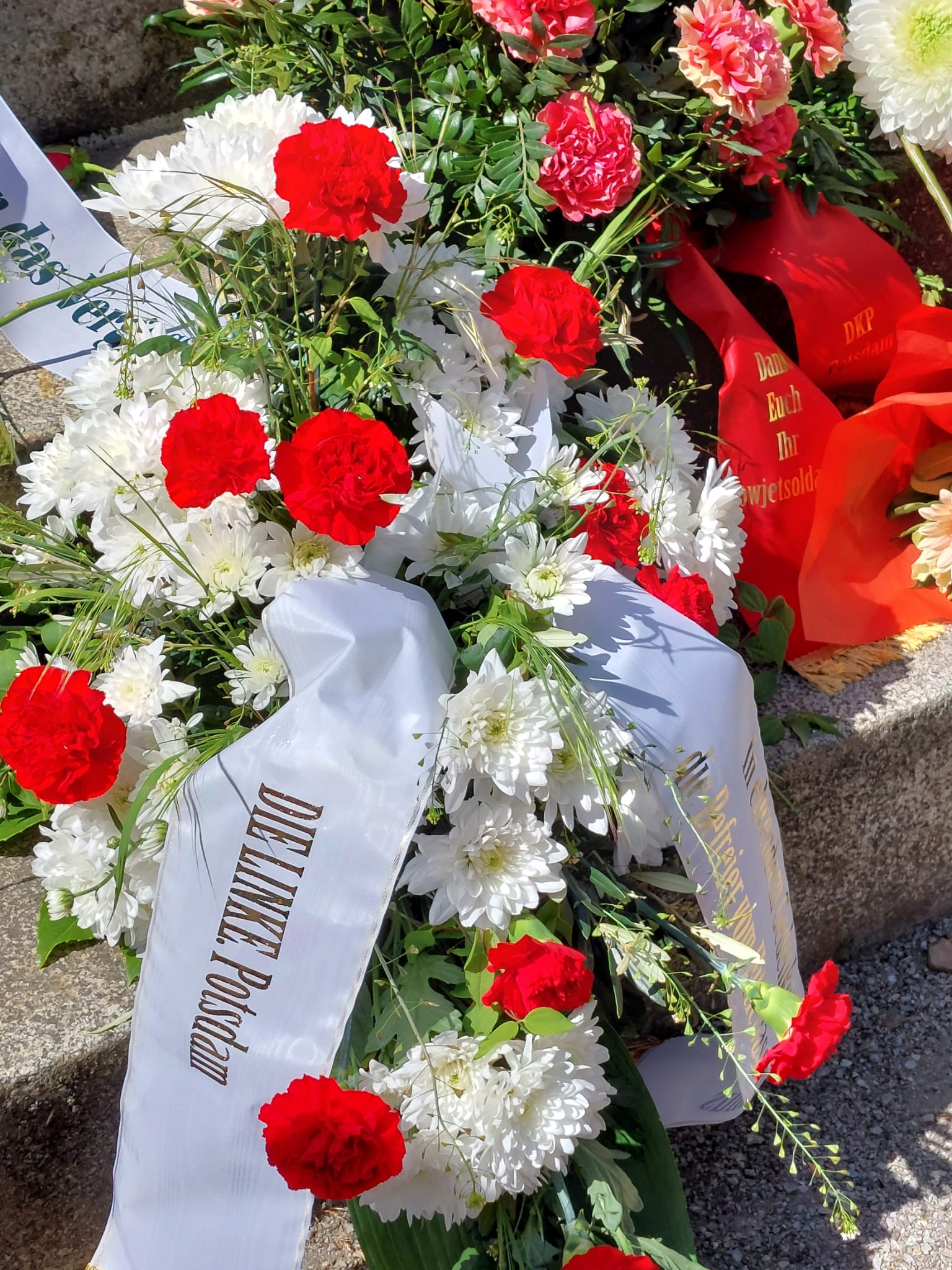Die Rede endete mit einer Schweigeminute für die Opfer des aktuellen Krieges. Dem schlossen sich Blumenniederlegungen und stilles Gedenken an.