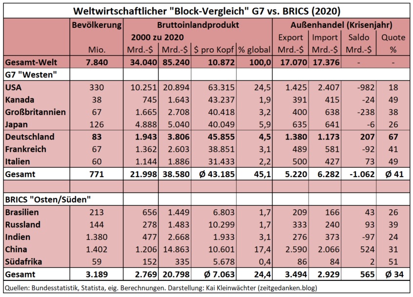 Deutschland befindet sich in einem (mitverschuldeten) Krieg – in einem von den USA und ihren westlichen Verbündeten angezettelten globalem Sanktions-/Wirtschaftskrieg gegen Russland, China und ihre Verbündeten. Eine große Mehrheit der Staaten und Völker im Osten und Süden verweigern diese Konfrontationspolitik. Grundsätzlich handelt es sich um die Fortsetzung eines bereits das 20. Jahrhundert prägenden, ökonomisch-weltanschaulichen Systemkonflikt „Marktwirtschaften/Demokratien“ gegen ihre Antipoden und vice versa.