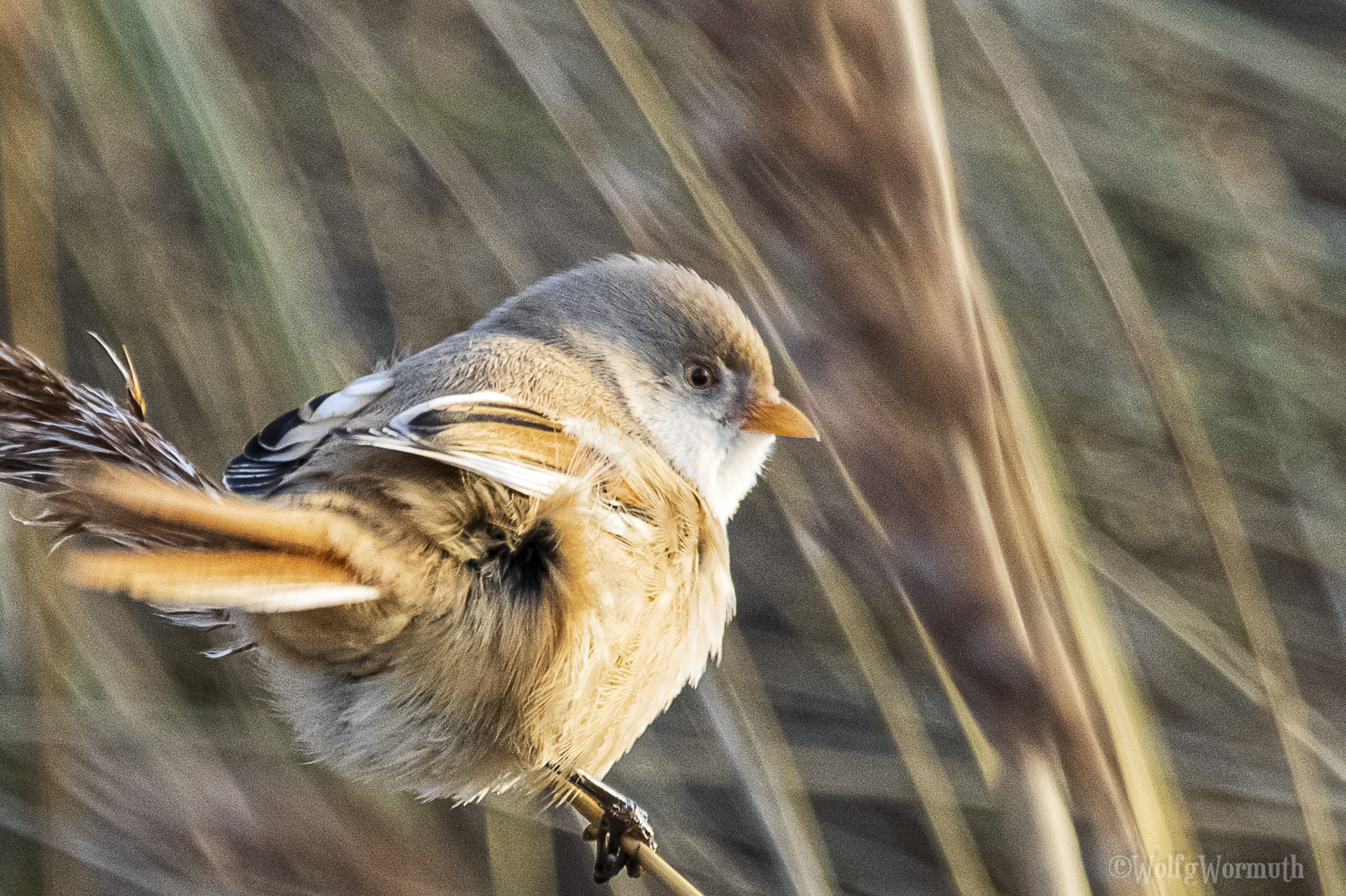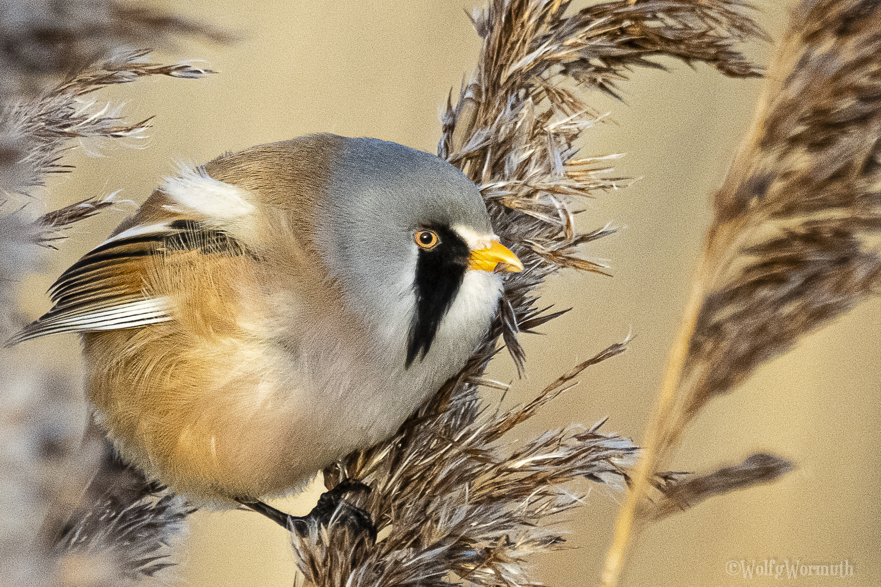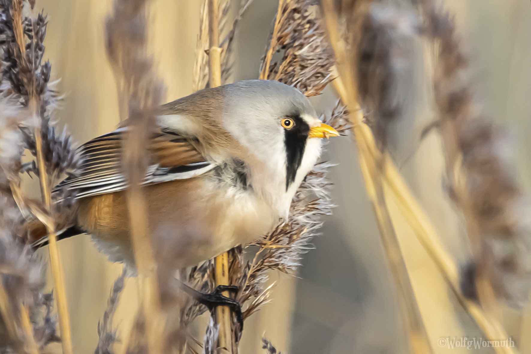 Die Bartmeise ist, auch wenn sie so ähnlich aussieht, keine Meise. Ihre nächsten Verwandten sind die Lerchen. Sie leben in weitläufigen Schilfflächen. Bartmeisen ernähren sich von Insekten oder wie im Bild zu sehen von Schilfsamen. Es sind Vögel, die sehr schnell von einem Schilf Zweig zum anderen fliegen bzw. hüpfen, ♀ erkennbar am Augenstreif, ♂ am schwarzen Bart.