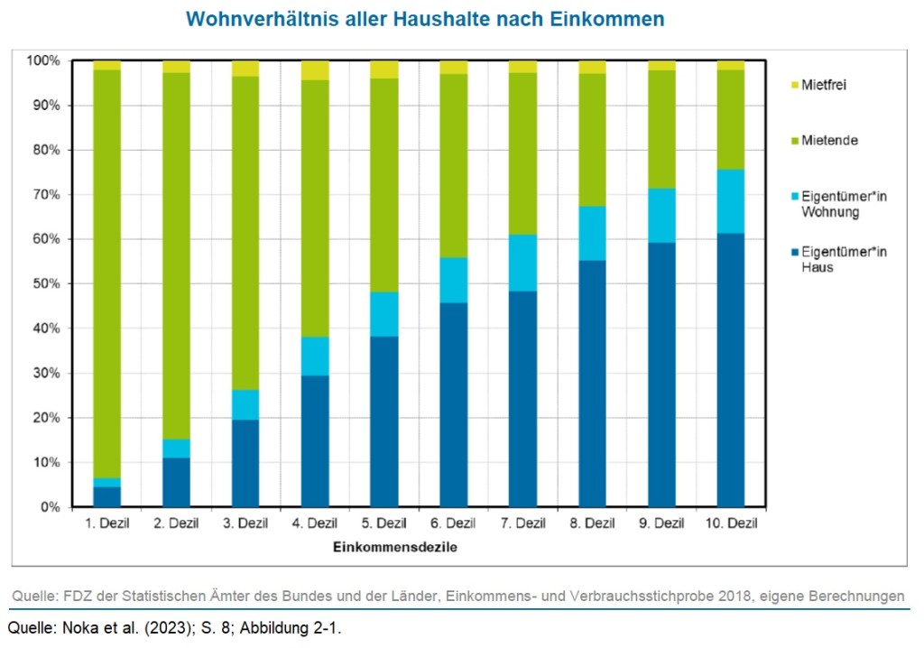 In der Gruppe mit den geringsten Einkommen wohnen ca. 91 Prozent der Bevölkerung zur Miete. Im höchsten Dezil ist die Situation (fast) umgekehrt. Dort besitzen ca. 75 Prozent der Haushalte die Immobilien in denen sie wohnen.