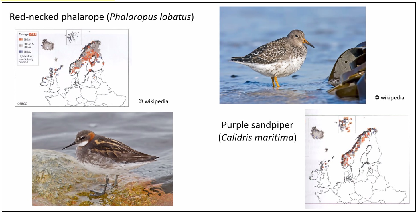 Traurige Prognose von Prof. Diekmann: Die meisten der „Nord- und Kälte-Arten“ werden im Zuge der Erderwärmung aussterben. Von ihm genannte Beispiele waren u.a. das Odinshütchen (Phalaropus lobatus) und der Meerstrandläufer (Calidris maritima). Wie die Folie von Prof. Diekmann zeigt, nimmt die Verbreitung beider Arten flächendeckend ab (rote Kästchen) und nur in den nördlichsten Küstenregionen begrenzt zu (blaue Kästchen).