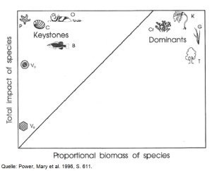 Hier ist wichtig zu beachten, dass nicht alle Arten gleich wichtig sind. Bestimmte Schlüsselarten, im Original von Robert T. Paine 1969 als Keystone Species bzeichnet, haben eine zentrale Stellung im Ökosystem. Geht diese eine Art verloren, verschwinden mit ihr auch viele andere.