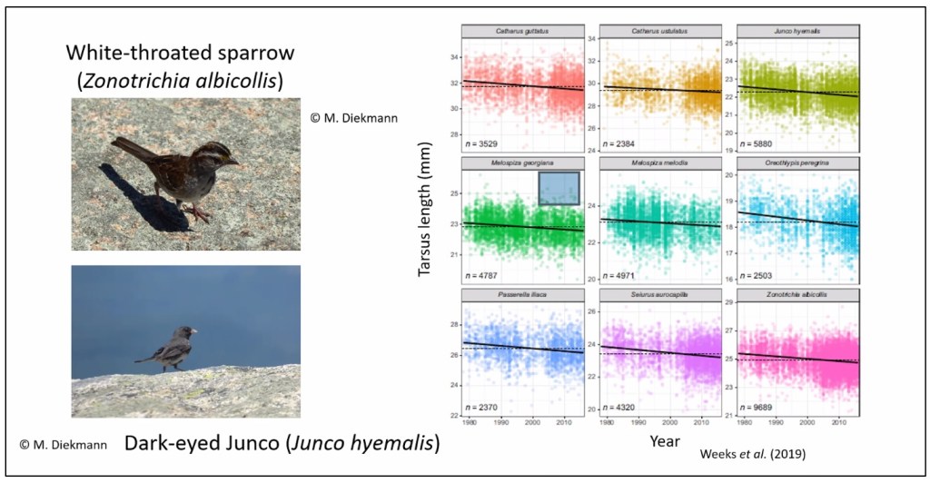 Viele Vogelarten verringern ihren Körperumfang. Sie brauchen auf Grund der milderen Winter nicht mehr so große Fettreserven. Prof. Diekmann erläuterte diesen Prozess der „Schrumpfung“ anhand der kürzeren Schienbeine (Tarsus) bei vielen Vogelarten.