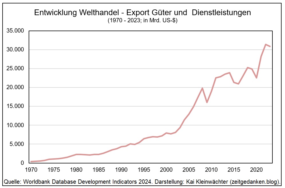 Seit den 1950er Jahren erholt sich der Welthandel vom Zusammenbruch in Folge des II. Weltkrieges und beginnt kontinuirlich zu wachsen. So betrug der weltweite Güterexport 1960 ca. 123 Mrd. US.$. Bis in die Gegenwart hat er sich um fast das 190fache erhöht. 2023 lag der internationalen Außentausch inklusive der Dienstleistungen bei über 30.000 Mrd. US-$.