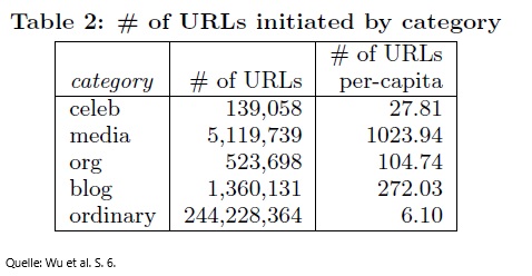 Andererseits hatten die Elite-Accounts eine weit überdurchschnittliche Produktion von Tweets. Um die Analyse zu vereinfachen, konzentrierten sich Wu et al. auf Tweets mit einer Url. Während Ordinary-Accounts im untersuchten Zeitraum ca. 6 Tweets mit URLs veröffentlichten, lag dieser Wert bei der Elite teilweise um den Faktor 150 höher. Wohlgemerkt waren die hier aufgeführten Ordinary-Accounts bereits in einer Liste vermerkt. Die Vermutung liegt nahe, dass Accounts die nicht auf Listen vermerkt waren, im Durchschnitt noch weniger Posts haben.