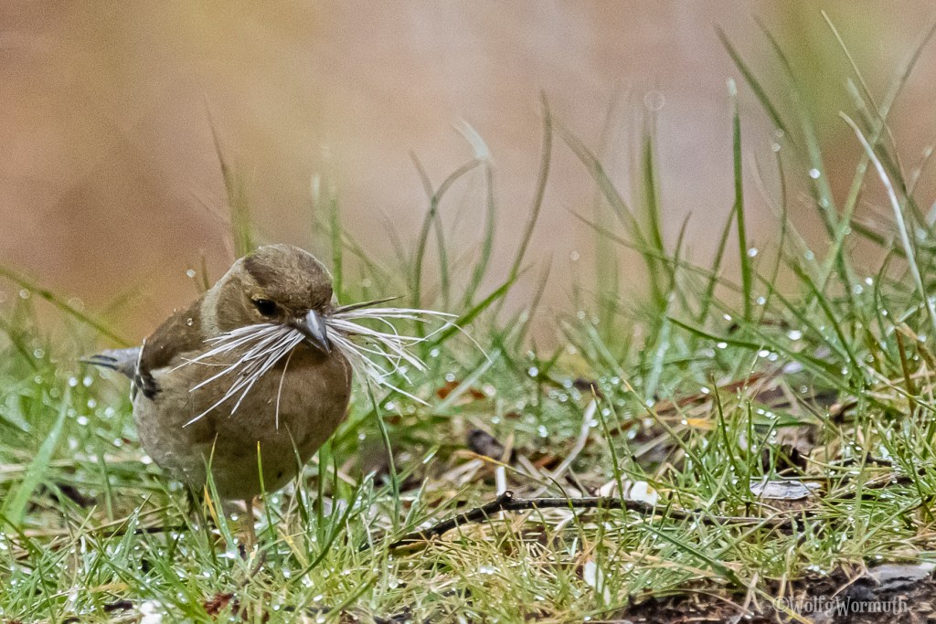Im April ist dieses Buchfinkenweibchen auf der Suche nach Baumaterial für das diesjährige Nest und ihren Nachwuchs; während der Finkenschlag des Männchens unüberhörbar zum Vogelkonzert des Frühjahrs gehört. Buchfinken sind einer unserer häufigsten heimischen Brutvögel. Nahrung suchen sie vorwiegend am Boden. Getarnt mit Moos und Flechten bauen sie ihre Nester in Astgabeln von Büschen und Bäumen.