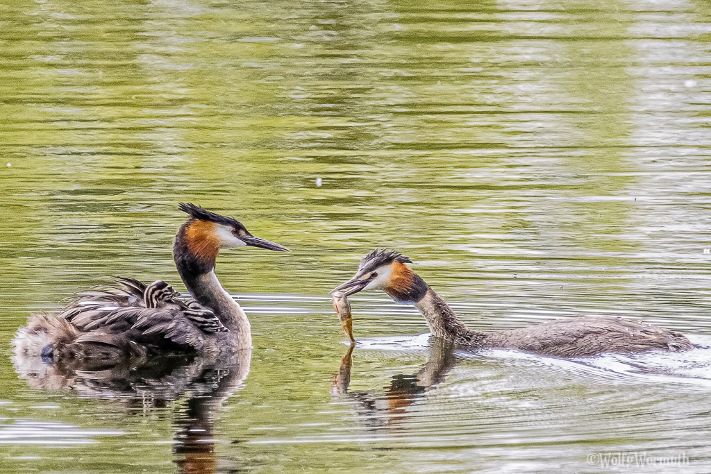 Die Haubentaucher gehören zur Familie der Lappentaucher. Als sehr stark an das Tauchen angepasste Wasservögel sind ihre Zehen mit Schwimmlappen ausgerüstet. Die Nester sind kleine schwimmende Inseln. Das Weibchen trägt die Jungen auf dem Rücken und sie werden vom Männchen mit Nahrung versorgt.