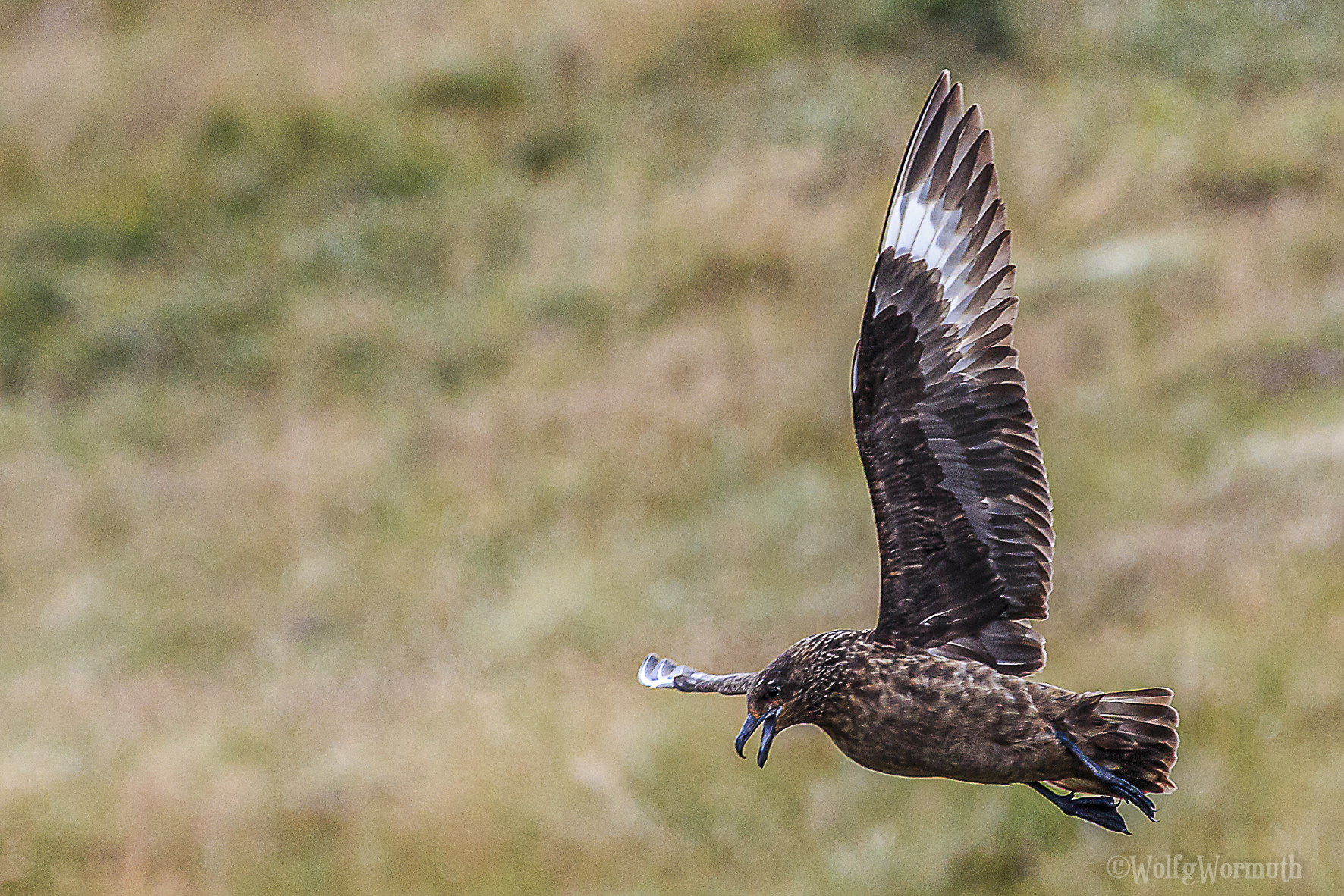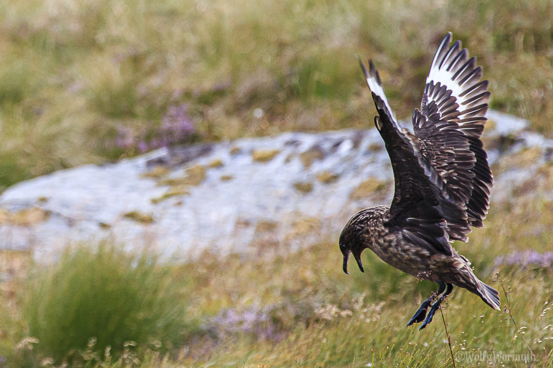 Skua sind Raubmöwen. Wie hier südlich von Ålesund (Norwegen), verfolgen sie andere gefiederte Fischfresser wie Seeschwalben, Basstölpel oder auch Möwen solange, bis diese ihre Nahrung aus dem Kropf würgen. Die Skua fängt die unverdauten Brocken im Flug auf.