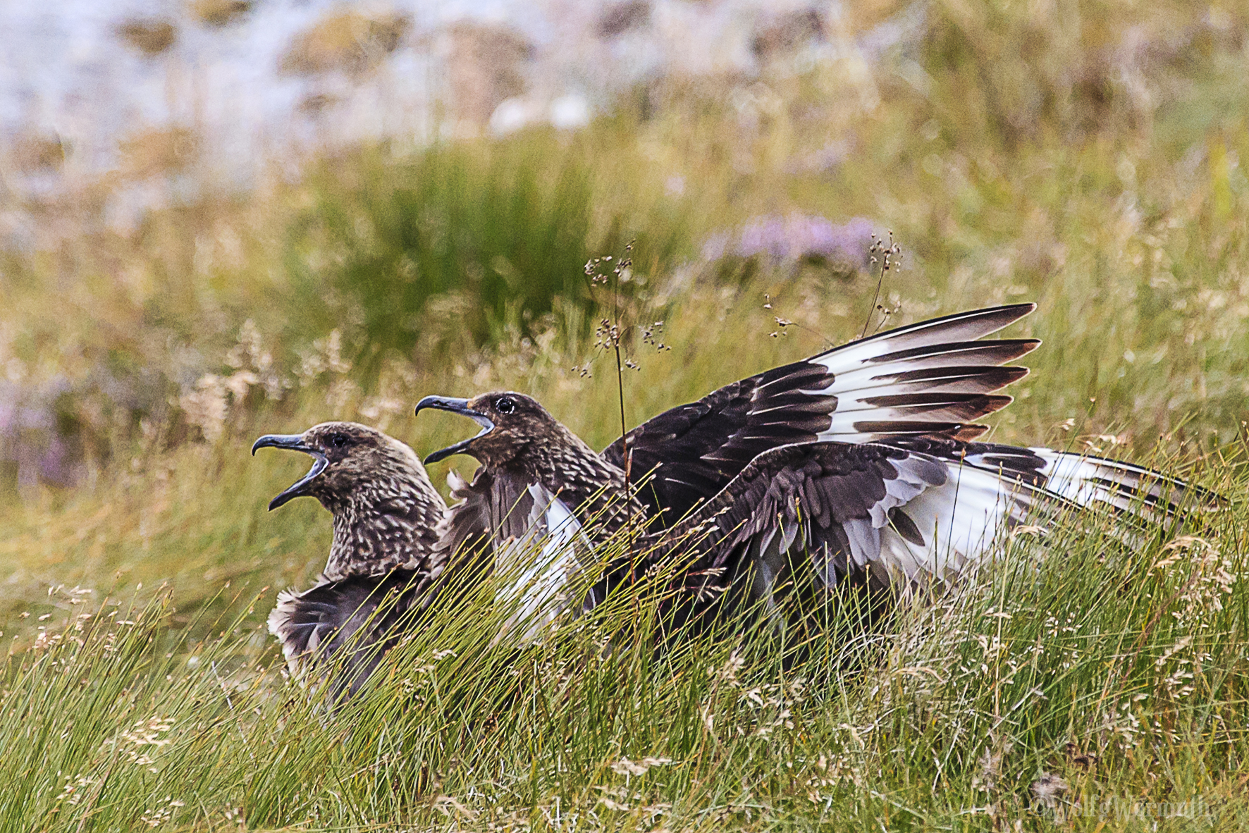 Die Vögel leben vorwiegend in Nordeuropa auf Felsinseln und in Küstenmoore. Das hier gezeigte Pärchen ist in Droh- bzw. Balzpose. Skua haben einen sehr kräftigen Schnabel. Um ihr Nest zu verteidigen, können sie auch gegenüber Menschen aggressiv werden.