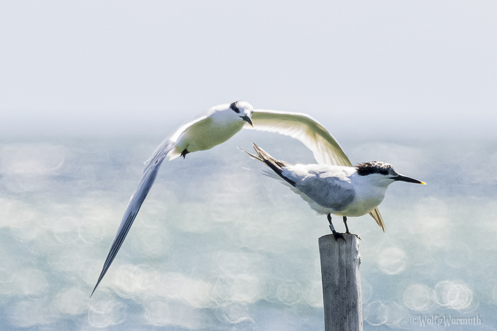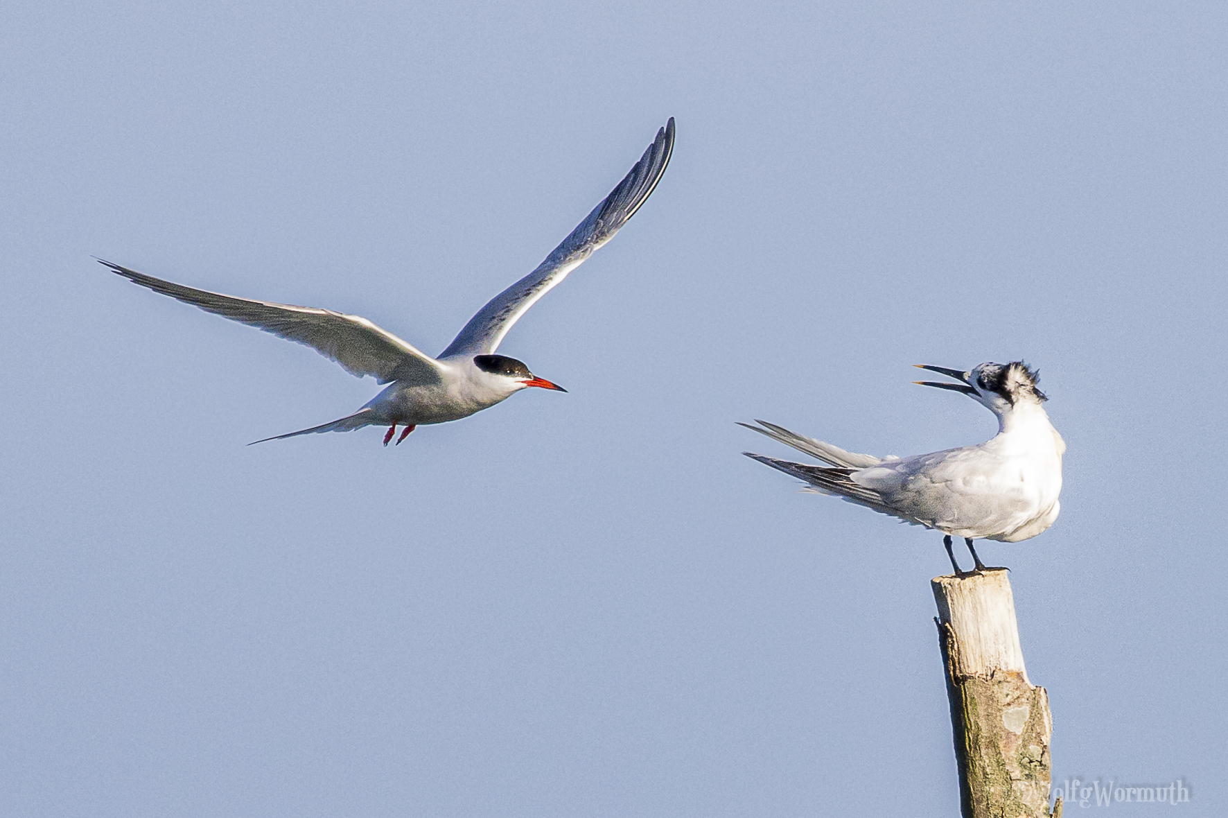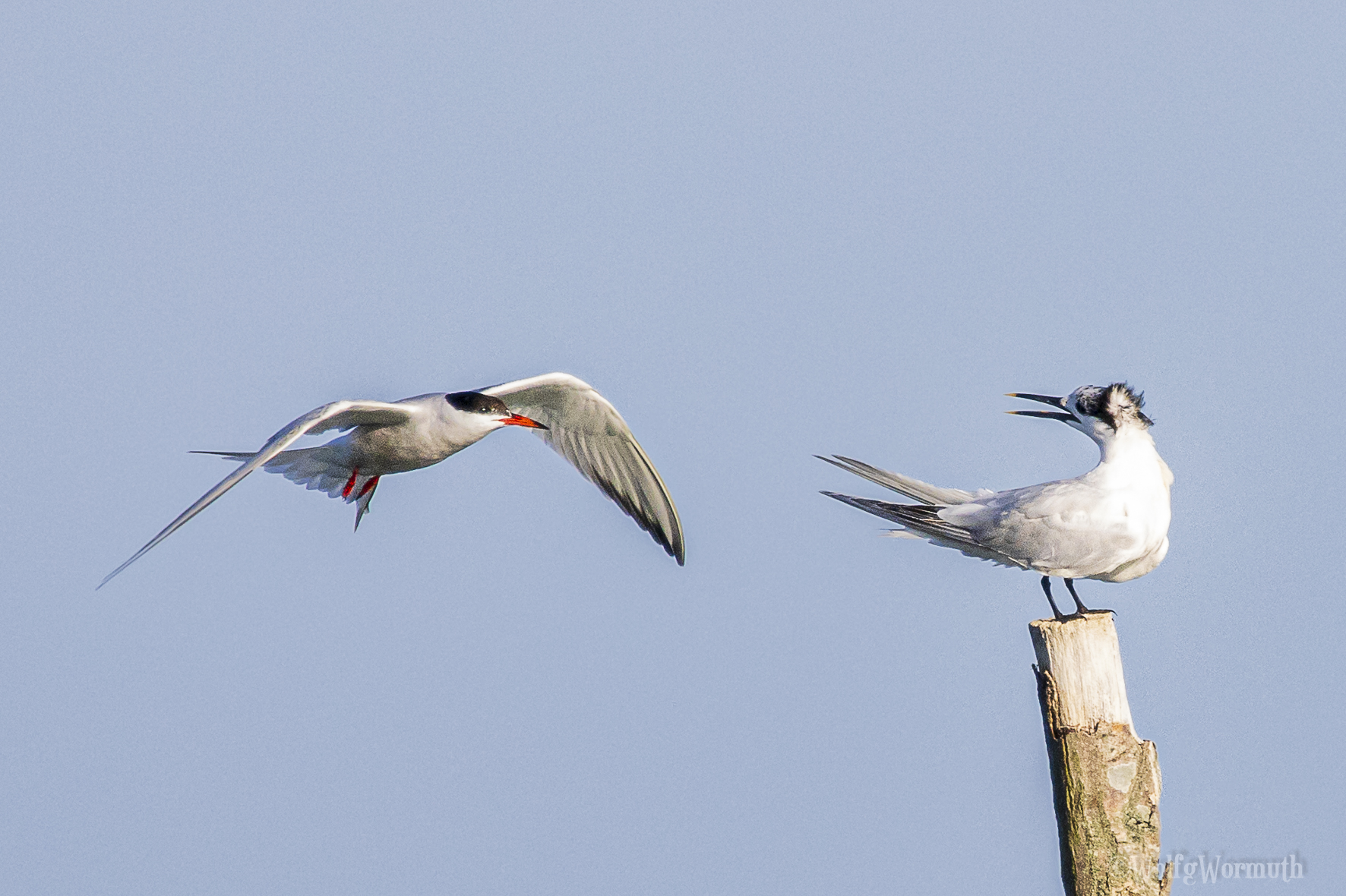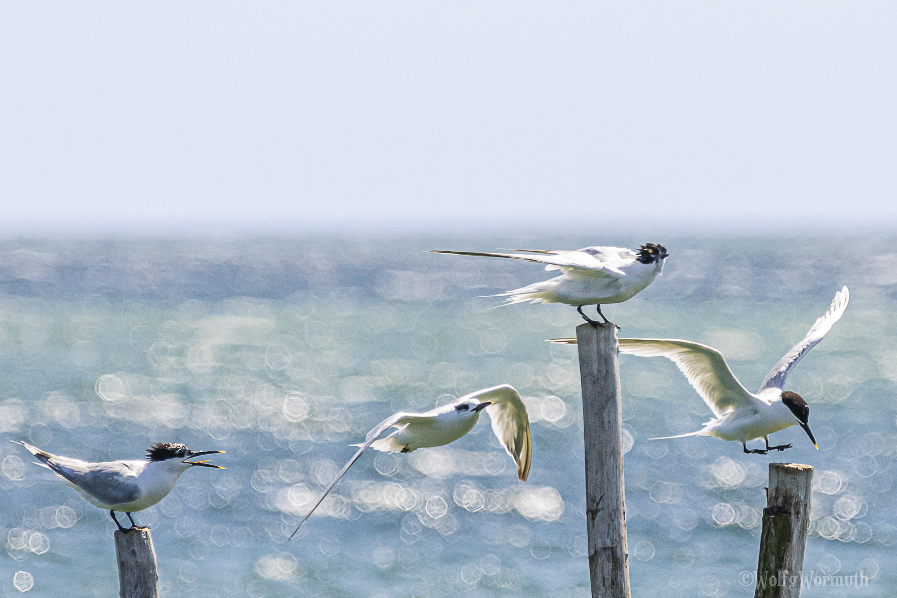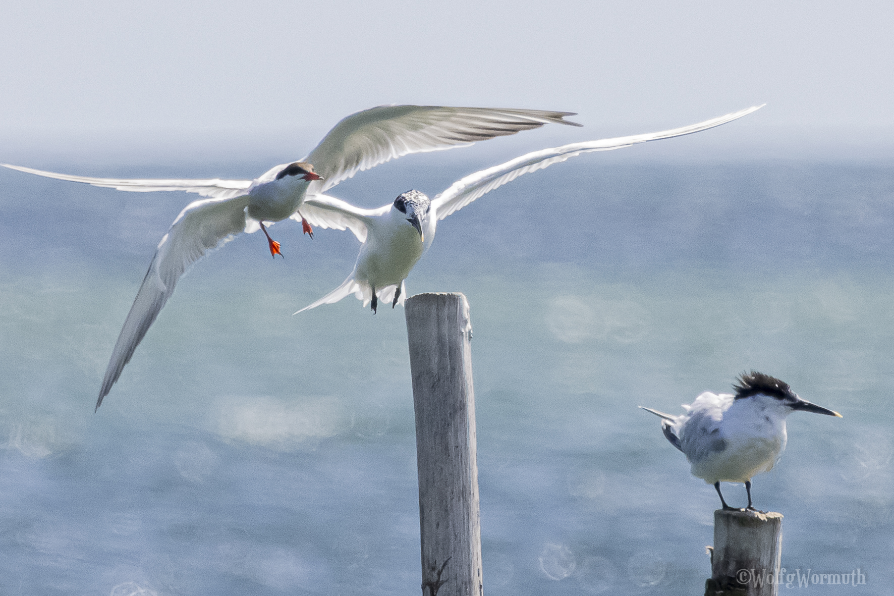Brandseeschwalben (schwarzer Schnabel) und Flussseeschwalben (orangeroter Schnabel) kämpfen wie hier in Dänemark auf der Insel Møn um die besten Plätze. Leider haben diese Vögel, wenn es um die Arterhaltung geht, keinen guten Platz. Sie sind vom Aussterben bedroht.