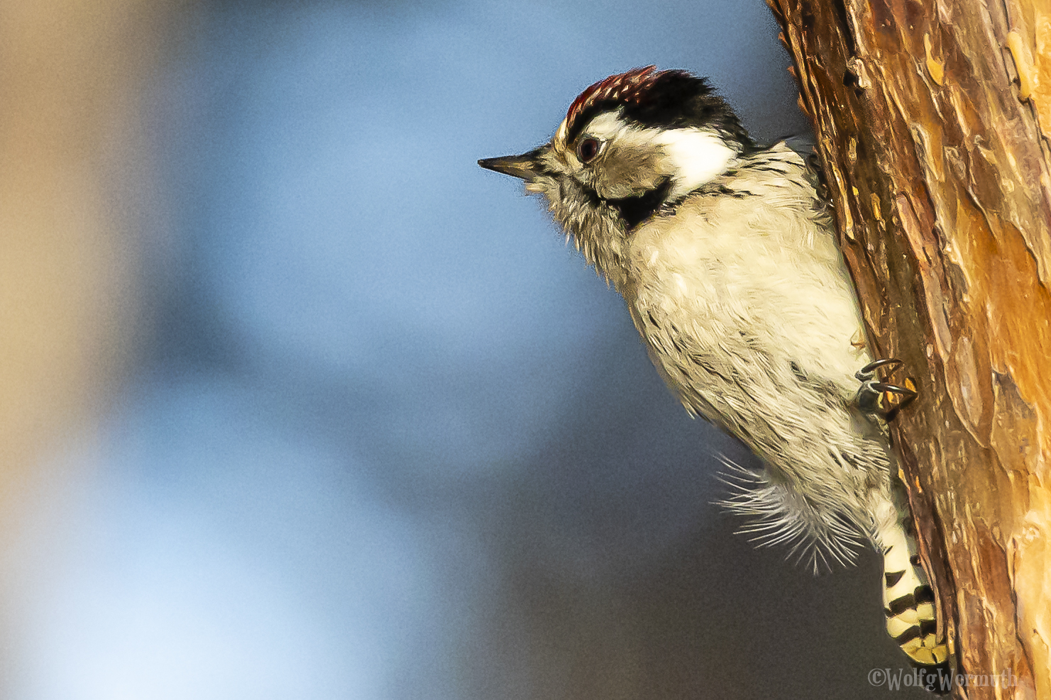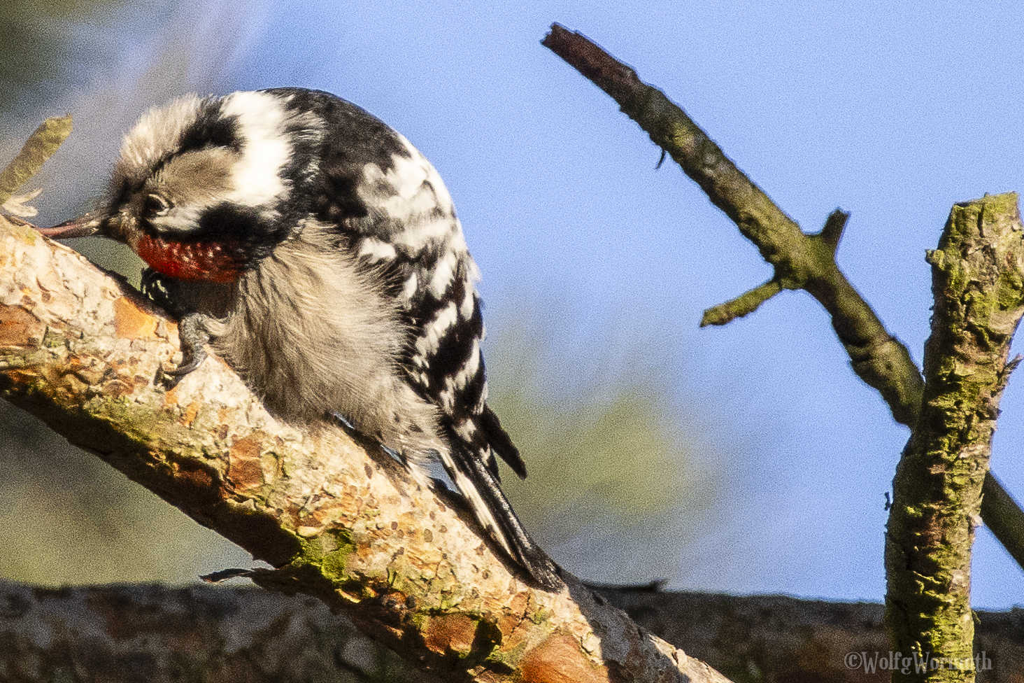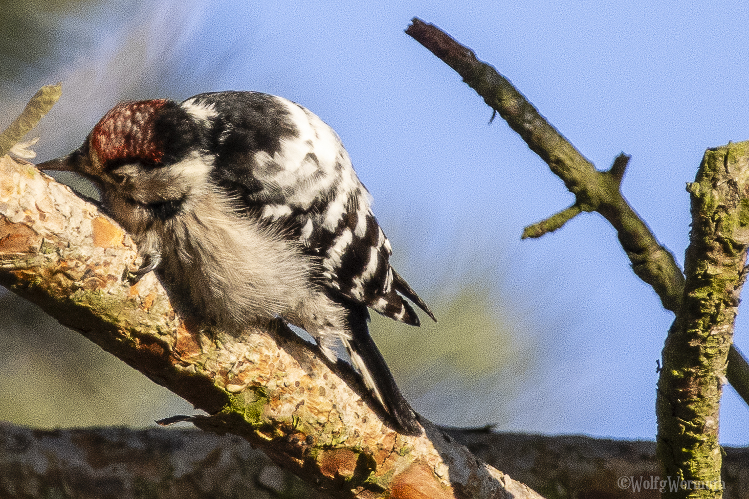 Der Kleinspecht lebt gern in Wassernähe wie hier am Gülper See bei Rinow im Winter 2022, aber auch in Auwälder und Streuobstwiesen. Wie seine 10 Verwandten ist er spezialisiert am senkrechten Stamm hoch zu klettern und dem Bauen von Nisthöhlen am Stamm. Sehr oft ist der Vogel bei einem Spaziergang an seinem Klopfen zu hören. Zentrales Erkennungsmerkmal ist das nicht vorhandenen Rot auf der Unterschwanzdecke. Er kann sehr gut sogar auf der Unterseite von Ästen klettern, was mich an den Baumläufer erinnert.