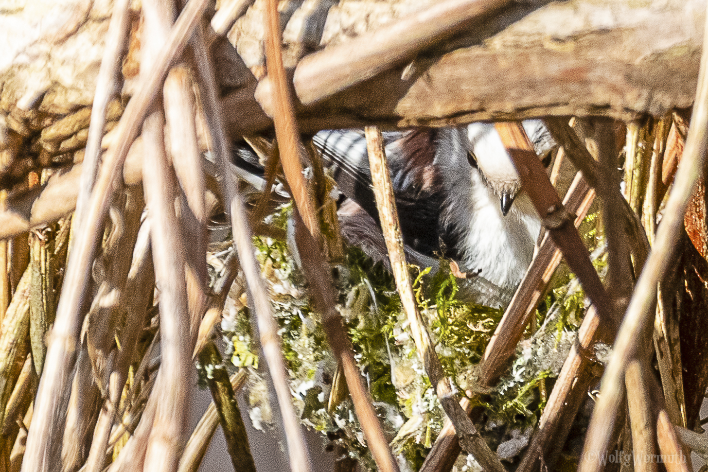 Fleißig baute die Meise an ihrem Nest. Es ging gut voran. Als ich Tage später, nach einem Frühjahrssturm wieder auf Beobachtung war – leider – lag das Nest zerstört am Boden.